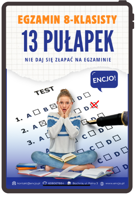 Zapomnij o przypadkowych treściach z Internetu! Twoje dziecko będzie korzystać z autorskich materiałów dydaktycznych opracowanych przez doświadczonych lektorów ENCJO. Zostały one stworzone dla jak najlepszego przygotowania do egzaminu 8-klasisty.