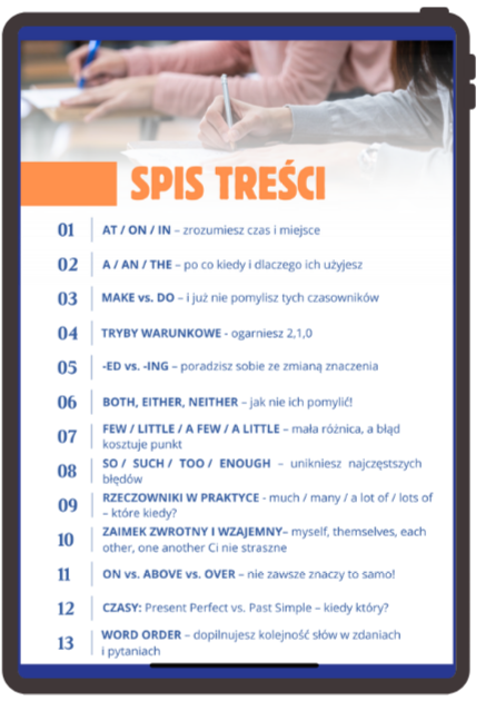 W e-booku zawarliśmy 13 najczęstszych pułapek językowych, które można znaleźć w arkuszach egzaminacyjnych. Dzięki niemu 8-klasista z łatwością rozpozna i zrozumie najczęściej popełniane błędy, które pojawiają się na egzaminie.