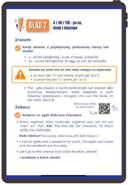 Przeanalizowaliśmy arkusze i odpowiedzi z kilki lat, aby Twoje dziecko zdążyło przećwiczyć problematyczne zagadnienia w prosty i przystępny sposób, zobaczyło różnicę między poprawną a błędną formą – i skutecznie zapamiętało tę dobrą!